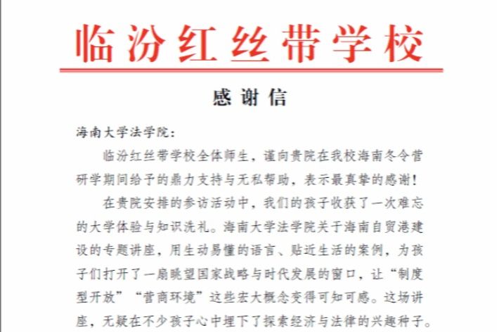 近日,法學(xué)院收到臨汾紅絲帶學(xué)校全體師生發(fā)來(lái)的感謝信,信中對(duì)法學(xué)院為該校海南冬令營(yíng)研學(xué)活動(dòng)提供的鼎力支持、精心安排與無(wú)私幫助表示最誠(chéng)摯的感謝。高度贊譽(yù)學(xué)院為孩子們打造了兼具知識(shí)深度與成長(zhǎng)溫度的研學(xué)體驗(yàn),更對(duì)法學(xué)院展現(xiàn)出的學(xué)術(shù)擔(dān)當(dāng)、社會(huì)情懷與青春風(fēng)采表達(dá)由衷敬佩。法學(xué)院將持續(xù)踐行高校社會(huì)責(zé)任,秉持育人初心與公益情懷,以更多元的形式傳遞法治溫度、播撒理想種子,為青少年成長(zhǎng)成才貢獻(xiàn)海大法學(xué)的智慧與力量。編輯:...