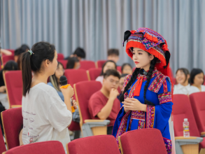 曾若馨就此次赴法演出感受,以及如何將苗服創(chuàng)新與苗族歌舞創(chuàng)作有機(jī)結(jié)合、繁榮少數(shù)民族文化等內(nèi)容向同學(xué)們做了詳細(xì)介紹,特別就著力加強(qiáng)少數(shù)民族文化人才培養(yǎng)引進(jìn)工作,尤其是少數(shù)民族民間優(yōu)秀文化傳承人和瀕危文化項(xiàng)目傳承人的培養(yǎng),確保少數(shù)民族文化后繼有人等方面談了自身體會。