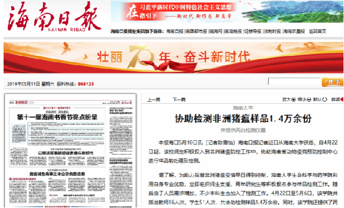 先后發(fā)現海南各類動物疫病數10次,開發(fā)高通量基因編輯技術1項,無乳鏈球菌現場快檢方法1項,并針對危害較大的達卡氣單胞菌敗血癥研發(fā)候選疫苗5株,至今已累計挽回各類經濟損失數10億元,并基于One health理念和“人病獸防”策略,在維護了海南“自貿港”中的生物安全與公共安全方面貢獻了相應力量。